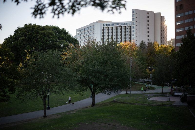 俄勒冈州是迁入人口超过迁出人口的排行榜第一名,图为居民在俄勒冈州波特兰市中心公园遛狗。(路透)