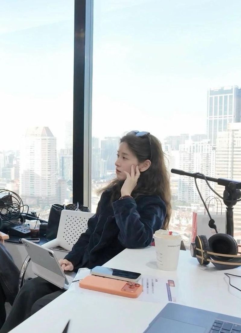 综合媒体报导,照片中的她穿着藏蓝色外套,头发染成了不张扬的深棕色,将墨镜别在头上,正一脸认真的看着自己手中的电脑。她表情严肃看着像是在思考,但是很有老板的架势。