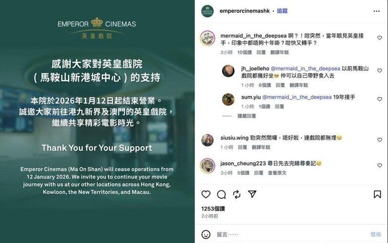 香港马鞍山新港城中心的「英皇戏院」,12日无预警宣布即日起结束营业,成为2026年开年后,香港第一家关闭的影城。(取材自Instagram)