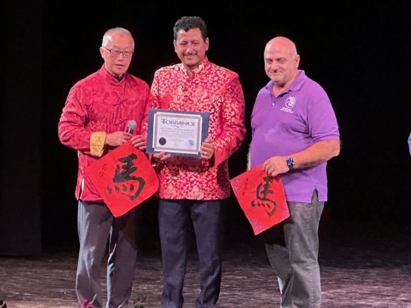 托伦斯市市长陈光豪(左)为南湾华人协会会长、圣盖博市议员赫乔治(中)颁发贺状。(记者张宏/摄影)