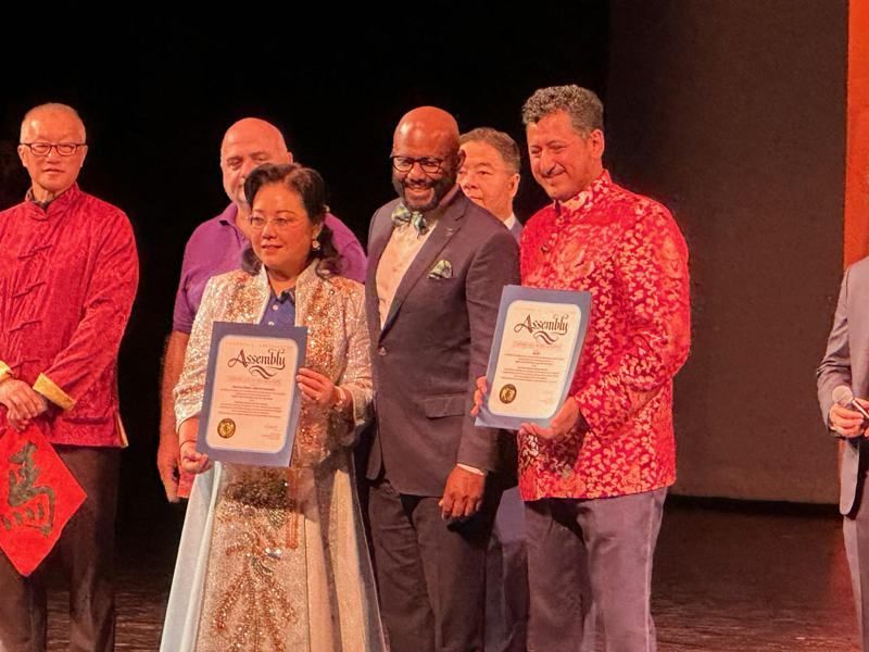 主办方美国加州南湾华人协会会长赫乔治(前右)与美中文化协会会长王薇(前左)领取贺状。(记者张宏/摄影)