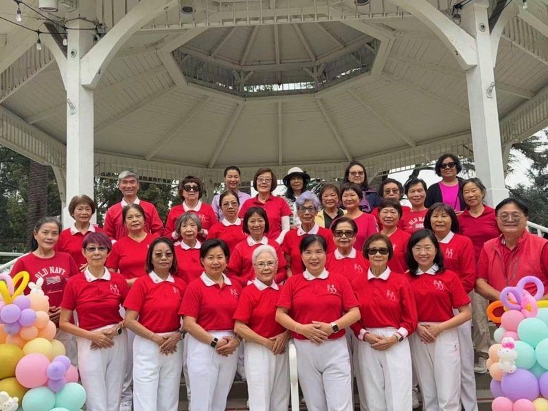 南加州元极舞分会平日于天普市固定举行晨间活动,成员合影留念,展现身心健康与社区凝聚力。(南加州元极舞分会提供)