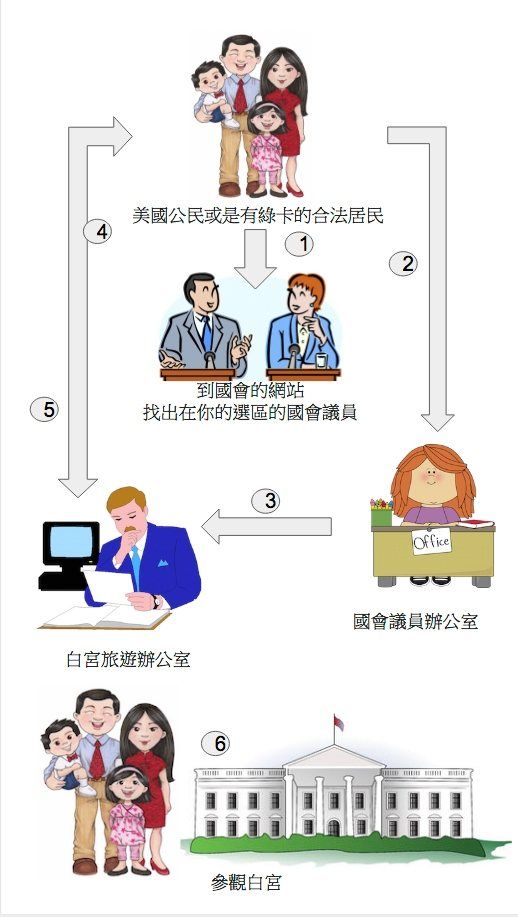有興趣前往華府參觀白宮者,首先須在國會的特別網站(http://www.house.gov/representatives/find/)輸入郵遞區號,找出自己選區的國會眾議員。接著㸃國會眾議員照片旁的名字,就可進入該議員的網站。