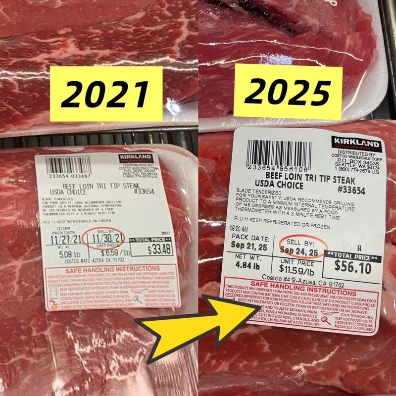 李女士說,她之前最常購買的好市多牛肉為「牛三角肉」(beef loin tri tip steak),是從牛肉臀部尖端切下的一塊三角形的部位,價格相較親民,肉質嫩,適合小炒肉。根據李女士提供的照片,2021年11月時,這款肉價格為每磅6.59美元;而今年9月22日,這款肉的價格為11.59美元。四年時間裡價格翻一倍。