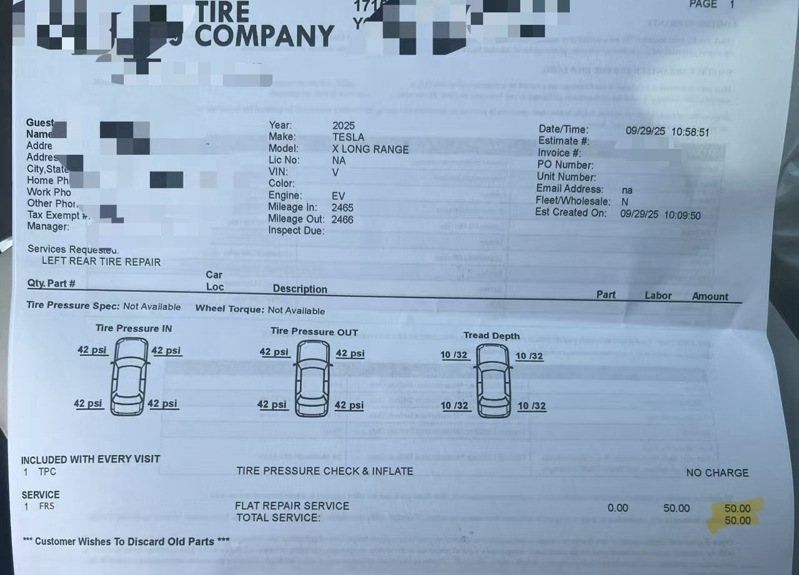 馮先生說,他先到一家連鎖輪胎店American Tire,等了一個多小時後,被告知特斯拉輪轂結構特殊,無法處理;再轉往另一家店,排隊近一小時才補好釘子。結果一個小洞就花掉他50美元。他苦笑表示:「疫情後通膨太嚴重,拔個釘子補個洞都要50美元...而且一個上午就這樣華麗過去了。」