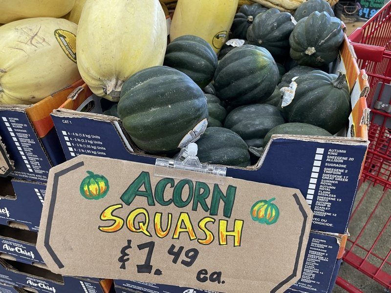 「Acorn Squash」是橡果南瓜,這種南瓜小小一個,有明顯脊稜,通常為深綠色。這類南瓜相比胡桃南瓜氣味更淡,口感更鬆,吃的時候讓人聯想到烤栗子或炸芋頭。
