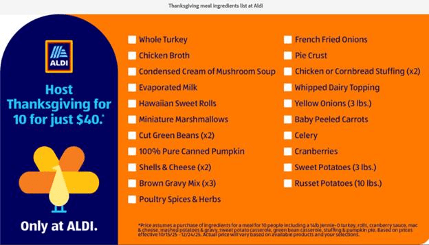 Aldi表示,組合食材包括一隻14磅重的火雞、馬鈴薯和麵包捲等等,比去年類似的感恩節大餐總價降低了7美元。Aldi美國執行長麥格拉斯(Atty McGrath)表示:「為購物者省錢是我們每天的使命,在假日期間尤其重要。」