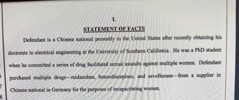 日前,30歲中國公民、南加大博士生翁偲喆(又名Steven Weng),因下藥性侵女性被捕,他面臨八項指控。根據本報獨家從法院取得的起訴書,翁偲喆作案時綑綁受害人、肛門注射迷藥及拍裸照等細節浮出水面。而且三受害人皆為他的親密好友,其中一位甚至是他的兒時髮小。翁偲喆還稱,如獲保釋,會逃回中國。