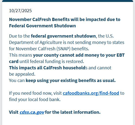 根據加州社會服務廳規畫,州政府每月花費11億元發放CalFresh補助,通常於每月初透過電子福利轉帳卡(EBT)入帳,但聯邦資金若耗盡,自11月起,這張卡片恐無法再充值。沙加緬度縣人道援助局局長戴伊說︰「我從業以來首次感到束手無策,我們只能請民眾撥打211熱線或尋求地方食物銀行。」