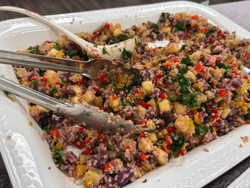 彩虹沙拉以藜麥為主,搭配蘋果、地瓜、紅椒、黃椒、葡萄乾、綠蔬等十多種天然食材,一道菜兼有紅、黃、綠、紫各種色彩。「菜色好看,吃得也開心。就這道菜,各種營養成分都夠了,吃下去身體舒服,腸胃也輕鬆。」林秀美說,準備這道菜前期最費工,光是切料就需三、四小時,但她樂在其中。