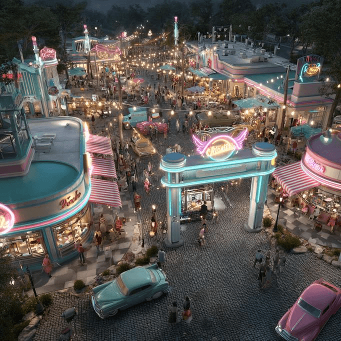 根據自稱「拉斯維加斯執行長」(CEO of Las Vegas)網紅兼計畫負責人小利歐(Daniel Leo Jr.),遊客進入園區時,將穿越一座「時光之門」,隨即展開一段跨越1950年代至1990年代的懷舊旅程。