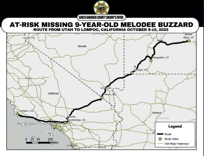 南加州聖塔芭芭拉縣九歲女孩梅勒迪(Melodee Buzzard)失蹤案,牽動無數人的心。聖地牙哥縣警方4日(周二)放出重要線索,女孩與母親阿舍莉(Ashlee Buzzard)一起開車旅行,僅有母親一人返家。調查人員發現,旅途中母女兩人均戴假髮,途中阿舍莉還將車子換上假牌照。