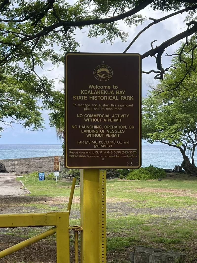 據該州立公園資料,Kealakekua Bay在夏威夷語意為「眾神之路」或「與神同在之地」。這裡是1779年英國探險家庫克(Captain James Cook)最後一次登陸並遇害的地方,因此在灣邊設有「庫克船長紀念碑」(Captain Cook Monument)。