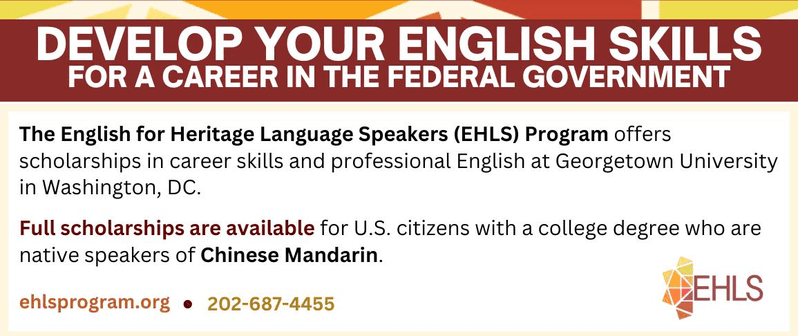 傳統語言使用者英語(EHLS)計劃主要針對母語為英語的民眾進行高級英語和職業技能培訓。該計畫的畢業生能夠成為有效的溝通者和聯邦職位的有力候選人。該計劃為擁有大學學位且母語為普通話的美國公民提供全額獎學金。邀請您進行申請、關注EHLS社交活動並訂閱EHLS時事通訊,並在職業生涯中做出貢獻。https://www.ehlsprogram.org/