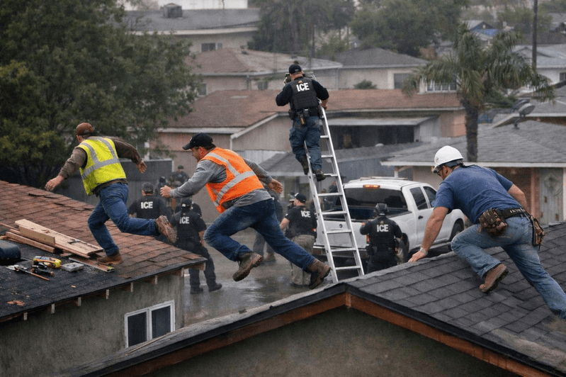 南加州蒙地貝婁一處工地遭ICE突襲,工人見狀驚慌逃逸,有人跳頂逃命,場面驚險。(示意圖,chatgpt生成)